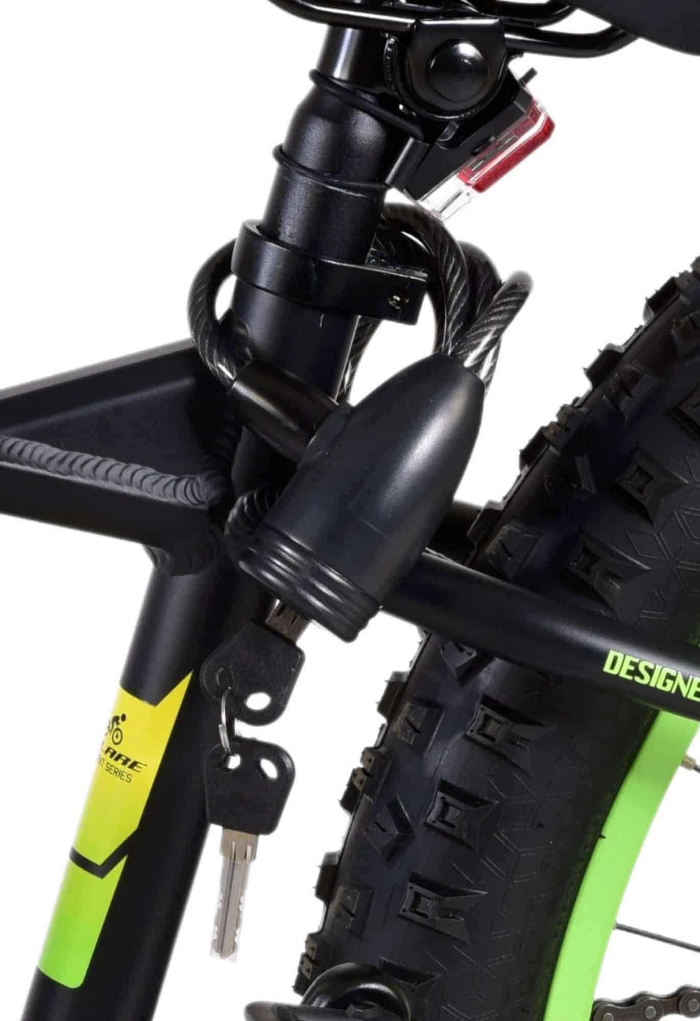 Veiligheid staat voorop! Daarom heeft deze gave fiets geen terugtraprem maar twee handremmen. Daarnaast heeft de fiets verlichting voor en achter, een stevig slot, en een bel. De gekantelde stuurpen zorgt voor een beter zicht op de weg, maar is daardoor niet in hoogte verstelbaar. Ook aan het comfort is gedacht. De mooie zwarte Volare fiets met gele en groene accenten heeft een extra licht aluminium frame, een standaard zodat je fiets netjes blijft staan, extra brede banden, 7 versnellingen, en zachte handvaten van kraton. Om zo lang mogelijk van de fiets te kunnen genieten is het zadel in hoogte verstelbaar.