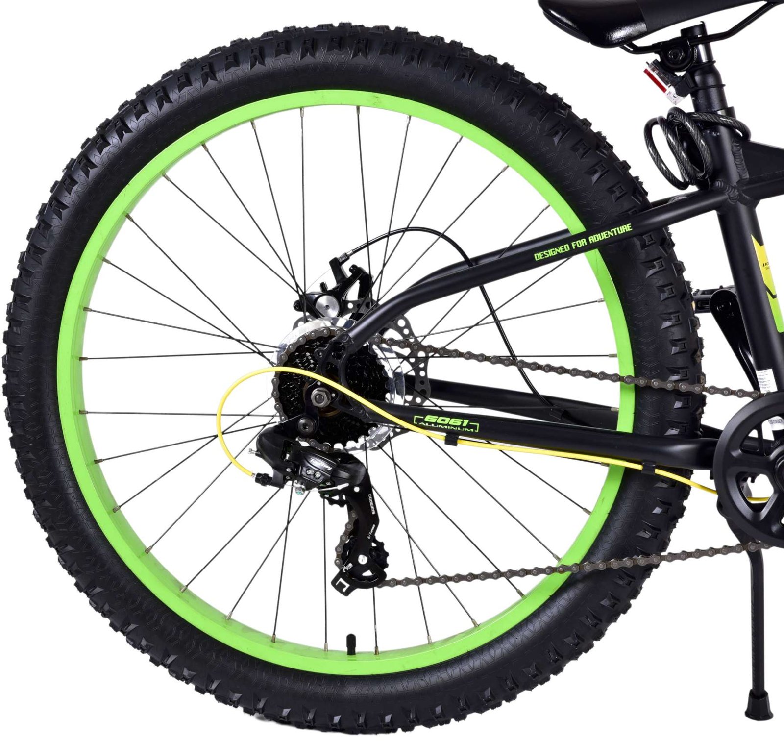 Door het aluminium frame is de fiets extra licht, Voorzien van 7 versnellingen, Met extra brede rubberen luchtbanden voor een ruig uiterlijk, De fiets heeft twee handremmen, maar geen terugtraprem