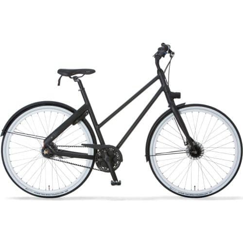 Cortina Blau damesfiets in framemaat 56cm. Kleur: Black Matt. Uitgerust met achter een Shimano Nexus 7-traps versnellingsnaaf met rollerbrake en voor een Shimano naafdynamo met rollerbrake. Opvallende details: aluminium frame, Gates belt drive – type CDN, in frame geintegreerde verlichting.